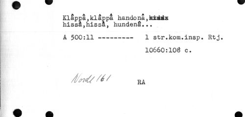 //// Klappa,klappa handonå,h±atdx //// hissa,hissa, hundenå... //// A 500:11 —------- 1 str.kom.insp. Rtj. //// Hg: //// 10660:108 c. //// RA //// < ////