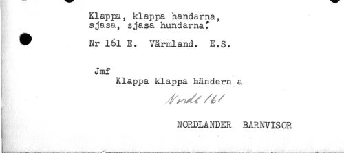 //// Klappa, klappa handarna, //// sjasa, sjasa hundarnaf //// ^ Nr 161 E. Värmland. E.S. //// Jmf //// Klappa klappa händern a //// NORDLANDER BARNVISOR ////