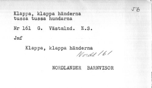 //// y.....6 //// Klappa, klappa händerna //// tussa tussa hundarna //// Nr 161 G. Västmlnd. E.S. //// * //// Jmf //// i //// .... . //// Klappa, klappa händerna //// NORDLANDER BARNVISOR ////