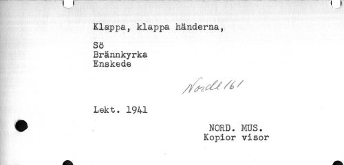 //// Klappa, klappa händerna, //// Sö //// Brännkyrka //// Enskede //// .' -.-I ! s //// Lekt. 1941 //// # NORD. MUS. //// Kopior visor //// * ////