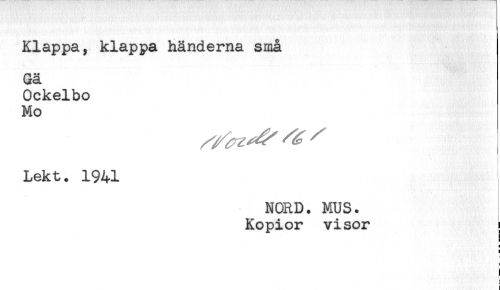 //// Klappa, klappa händerna små //// Gä //// Ockelbo //// Mo //// Lekt. 1941 //// NORD. MUS. //// Kopior visor ; //// ) //// i< //// < //// F ////
