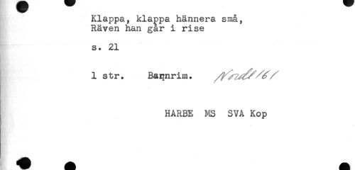 //// Klappa, klappa hännera små, //// Räven han gar i rise //// s. 21 //// 1 str. Baqnrim. //// j HARBE MS SVA Kop ////