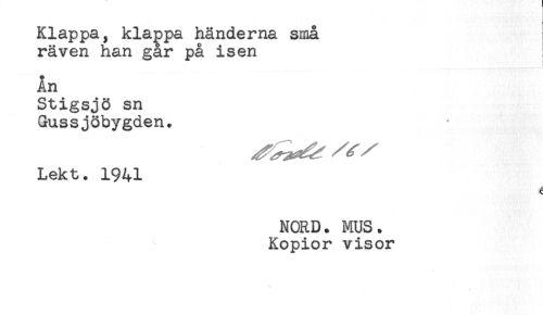 //// Klappa, klappa händerna små //// räven han gar på isen ! //// Ån //// Stigsjö sn //// Gussjöbygden. //// Lekt. 1941 //// NORD. MUS. //// ' Kopior visor ////