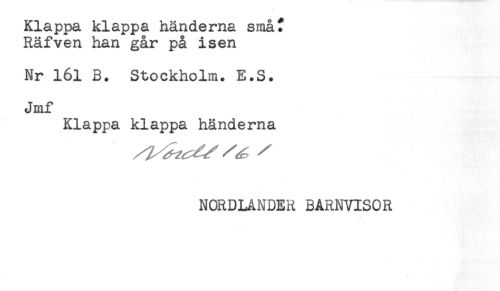 //// Klappa klappa händerna småf //// Räfven han går på isen //// Nr 161 B. Stockholm. E.S. //// Jmf //// Klappa klappa händerna //// NORDLANDER BARNVISOR //// * ////