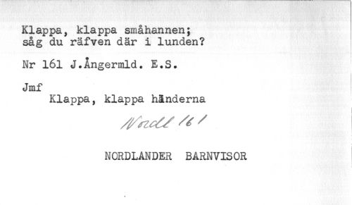 //// Klappa, klappa småhannen; //// såg du räfven där i lunden? //// Nr 161 J.Ångermld. E.S. //// Jmf //// Klappa, klappa händerna //// i //// - //// NORDLANDER BARNVISOR ////
