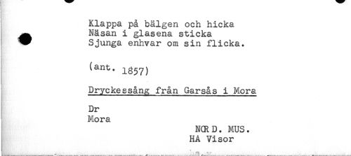 //// ET //// Klappa på bälgen och hicka //// ^ Näsan i glasena sticka //// V Sjunga enhvar om sin flicka. //// § //// (ant. ig^y) //// Mi- ' //// Dryckessång från Garsås i Mora //// Dr //// Mora //// N(RD. MUS. //// HA Visor //// **t ////