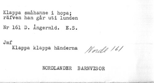 //// Klappa småhanne i hopa; //// räfven han går uti lunden //// Nr 161 D. Ångermld. E.S. //// Jmf //// Klappa klappa händerna //// NORDL AN DER B ARNVIS OR ////