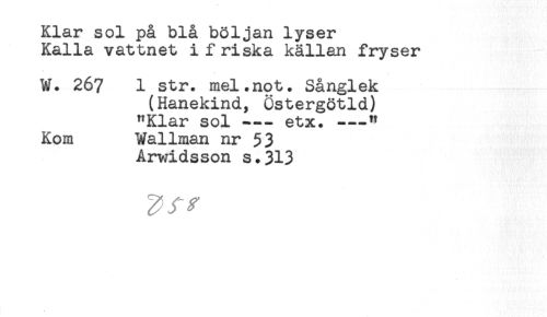 //// Klar sol på blå böljan lyser //// Kalla vattnet i friska källan fryser //// W. 267 1 str. mel.not. Sånglek //// (Hanekind, Östergötld) //// "Klar sol---etx.---" //// Kom Wallman nr 53 //// Arwidsson s.313 ////