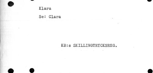 //// Klara //// Se: Clara //// ! //// KB:s SKILLINGTRYCKSREG. //// m,' * ////