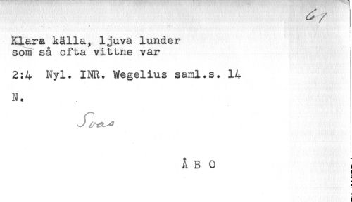 //// * - * — - - //// t //// Klara källa, ljuva lunder //// som så ofta vittne var ! //// t //// 2:4 Nyl. INR. Wegelius saml.s. 14 //// N. //// r i //// . t //// i //// . //// ÅBO , //// ) //// 5 //// H //// H ////