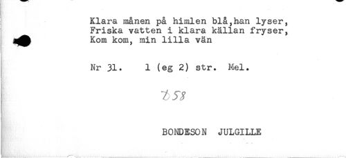 //// Klara månen på himlen blå,han lyser, //// Friska vatten i klara källan fryser, //// Kom kom, min lilla vän //// I Nr 31. 1 (eg 2) str. Mel. //// BONDESON JULGILLE //// ** -r - — ////