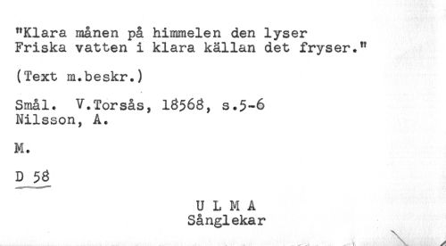 //// "Klara månen på himmelen den lyser //// Friska vatten i klara källan det fryser." //// (Text m.beskr.) //// Smål. V.Torsås, 13563, s.5-6 //// Nilsson, A. //// M. //// D $3 //// U L M A //// Sånglekar ////