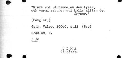 //// "Klara sol på himmelen den lyser, //// och varma vattnet uti kalla källan det //// fryser." //// (Sånglek.) //// Gstr. Valbo, 10060, s.22 (8:0) //// Hedblom, F. //// D 56 //// U L M A //// Sånglekar ////