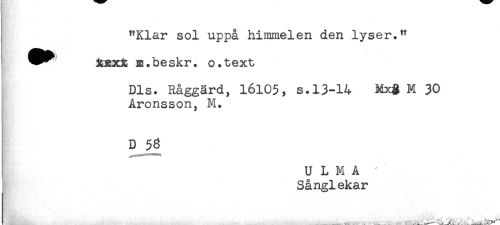 //// i "Klar sol uppå himmelen den lyser." //// ^^ s.beskr. o.text //// Dis. Råggärd, 16105, s.13-14 MxgM 30 //// Aronsson, M. //// . //// D //// U L M A ' //// : Sånglekar ////
