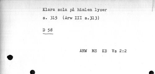 //// Klara sola på himlen lyser j //// s. 315 (Arw III s.313) //// / //// D 58 //// ARW MS KB Vs 2:2 //// Hr ////