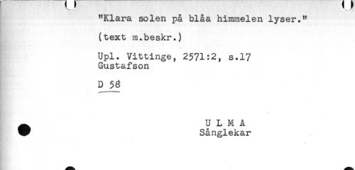 //// "Klara solen på blåa himmelen lyser." //// (text m.beskr.) //// Upl. Vittinge, 2571:2, s.17 //// Gustafson //// D 58 //// - //// . //// ^ U L M A //// W Sånglekar ////