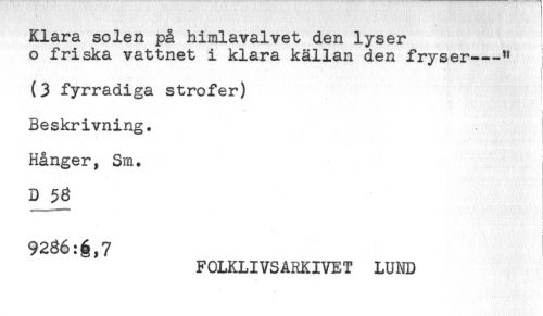 //// < //// Klara solen på himlavalvet den lyser //// o friska vattnet i klara källan den fryser---" //// - //// (3 fyrradiga strofer) //// ' *'' //// * //// < //// Beskrivning. //// Hånger, Sm. //// D 53 //// t //// 9286:é,7 //// FOLKLIVSARKIVET LUND ////