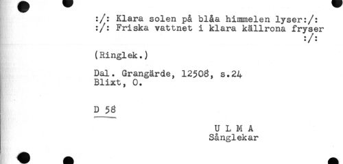//// :/: Klara solen på blåa himmelen lyser:/: //// :/: Friska vattnet i klara källrona fryser //// */ - //// (Ringlek.) //// Dal. Grangärde, 12506, s.24 //// Blixt, 0. //// t D 58 //// U L M A //// Sånglekar ////