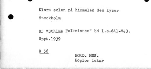//// s //// Klara solen på himmelen den lyser //// V Stockholm //// w //// Ur "Sthlms Folkminnen" bd l.s.641-643. //// Uppt.1939 //// ; //// D 58 //// NORD. MUS. //// Kopior lekar ////