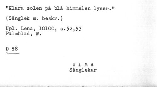 //// "Klara solen på blå himmelen lyser." //// (Sånglek m. beskr.) //// <* //// Upl. Lena, 10100, s.52,53 //// Palmblad, W. //// D 58 //// t //// U L M A //// Sånglekar ////