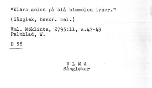 //// "Klara solen på blå himmelen lyser." //// (Sånglek, beskr. mel.) //// .. * //// Vml. Möklinta, 2795:11, s.47-49 //// Palmblad, W. //// D 58 //// U L M A //// Sånglekar ////