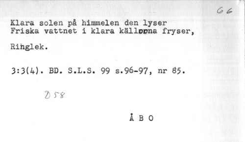 //// Klara solen på himmelen den lyser //// Friska vattnet i klara källopna fryser, //// ^. . //// Ringlek. //// ' ) //// ' - '. ' < //// 3:3(4). BD. S.L.S. 99 s.96-97, nr 8$. //// 2) //// Å B 0 ////