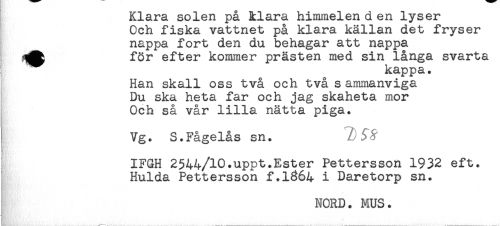 //// Klara solen pa Hara himmelen d en lyser //// Och fiska vattnet på klara källan det fryser //// nappa fort den du behagar att nappa //// för efter kommer prästen med sin långa svarta //// ! kappa. //// Han skall oss två och två s ammanviga //// Du ska heta far och jag skaheta mor //// Och så vår lilla nätta piga. //// Vg. S.Fågelås sn. //// IFGH 2544/10.uppt.Ester Pettersson 1932 eft. //// Hulda Pettersson f.1364 i Daretorp sn. //// NORD. MUS. ////