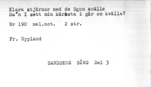 //// Klara stjärnor med de ögon snälle //// Ha*n I sett min käråsta i går om kvälle? //// Nr 190 mel.not. 2 str. //// Fr. Uppland //// i. //// ! //// SANDBERG SÅNG Del 3 //// t //// i //// t //// ! //// ! //// ! //// i //// ! //// t ////