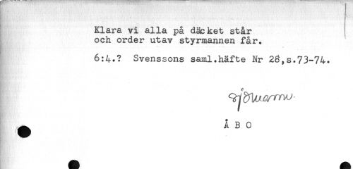 //// " — - *'- -- - - - . . , //// Klara vi alla på däcket står //// och order utav styrmannen får. //// . . //// 6:4.? Svenssons saml.häfte Nr 23,s.73-74. //// ^ ÅBO ////