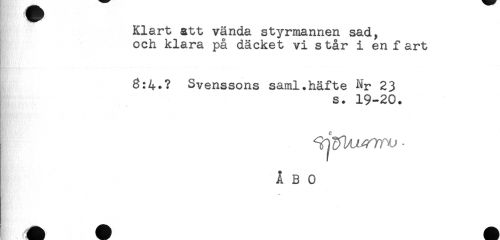 //// Klart att vända styrmannen sad, //// och klara på däcket vi står i en fart //// 8:4.? Svenssons saml.häfte Nr 23 //// s. 19-20. //// ÅBO ////