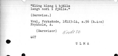 //// t "Kling klang i bjälla //// ! långt norl i fjälla." //// I (Barnvisa.) //// ' Vrml, Fryksände, 18123:14, s.56 (h.4:o) //// t Frykholm, A. //// ) //// } (Barnvisor) ^^^ //// } 407 //// ^ U L M A //// * ////
