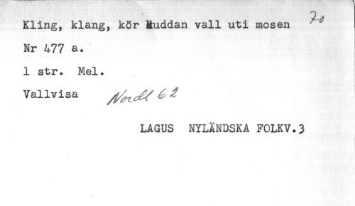 //// Kling, klang, kör Ruddan vall uti mosen //// Nr 477 a. //// 1 str. Mel. //// Vallvisa ^^ ^ ^ //// LAGUS NYLÄNDSKA FOLKV.3 ////