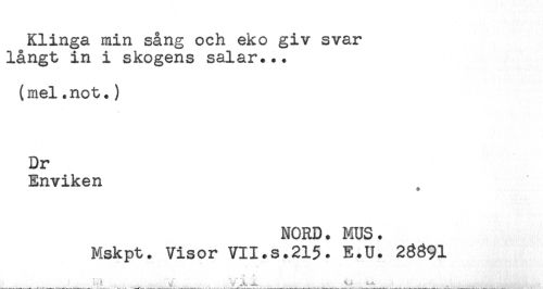 //// Klinga min sång och eko giv svar //// långt in i skogens salar... //// (mel.not.) //// Dr //// Enviken //// NORD. MUS. //// Mskpt. Visor VII.s.215. E.U. 28891 //// ^ Al ////