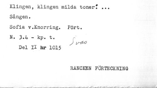 //// Klingen, klingen milda toner. ... //// Sången. //// Sofia v.Knorring. Pört. //// N. 3.4 - kp. t. //// Del II hr 101$ //// RANCKEN FÖRTECKNING ////