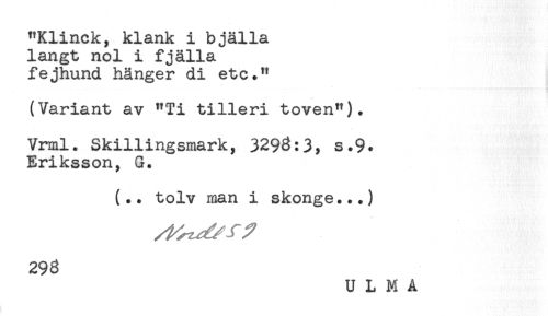 //// "Klinck, klank i bjälla //// långt nol i fjälla //// fejhund hänger di etc." //// (Variant av "Ti tilleri toven"). //// Vrml. Skillingsmark, 3298:3, s.9. //// Eriksson, G. //// (.. tolv man i skonge...) //// 298 //// U L M A ////