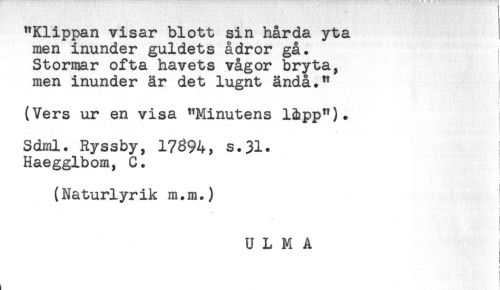 //// "Klippan visar blott sin hårda yta //// men inunder guldets ådror gå. //// Stormar ofta havets vågor bryta, //// men inunder är det lugnt ändå." //// (Vers ur en visa "Minutens l&pp"). //// Sdml. Ryssby, 17^94, s.31. //// Haegglbom, C. //// (Naturlyrik m.m.) //// t //// ^ t //// ! //// * //// U L M A //// s - ! //// } //// < ////