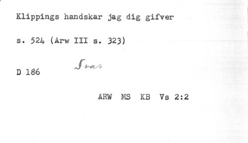 //// Klippings handskar jag dig gifver //// i //// s. 524 (Arw III s. 323) //// D 186 //// ARW MS KB Vs 2:2 ////