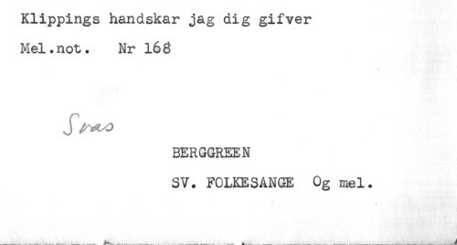 //// Klippings handskar jag dig gifver //// Mel. not. Nr 168 //// BERGGREEN //// SV. FOLKESANGE Og mel. ////