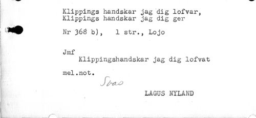 //// Klippings handskar jag dig lofvar, //// Klippings handskar jag dig ger //// Nr 368 b), 1 str., Lojo //// Jmf //// Klippingshandskar jag dig lofvat //// f //// mel.not. //// LÅGUS NYLAND ////