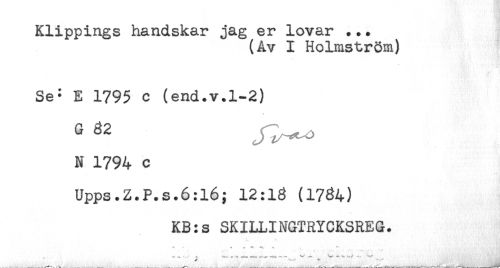 //// Klippings handskar jag er lovar ... //// (Av I Holmström) //// Se- E 1795 c (end.v.1-2) //// G ^ J^o //// N 1794 c //// Upps.Z.P.s.6:l6; 12:1g (1734) //// KB:s SKILLINGTRYCKSREG. ////