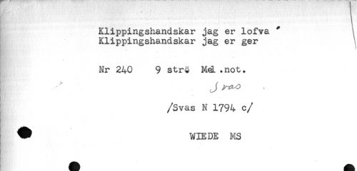 //// . . . . .. ^ -. - - - - . - ^ //// Klippingshandskar jag er lofva ^ //// Klippingshandskar jag er ger //// Nr 240 9 strö MéL .not. //// /Svas N 1794 c/ //// . //// V WIE DE MS //// * //// i //// A* ////