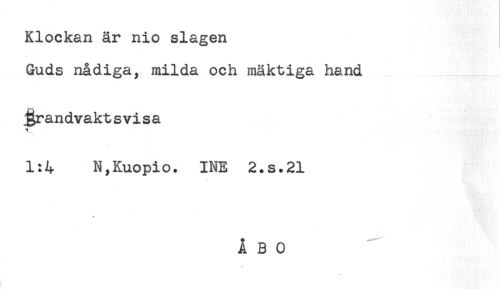 //// Klockan är nio slagen //// Guds nådiga, milda och mäktiga hand //// brandvaktsvisa //// 1:4 N,Kuopio. INE 2.S.21 //// y //// A B 0 ////