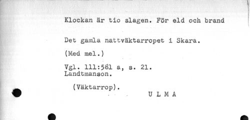 //// Klockan är tio slagen. För eld och brand //// * * //// . //// Det gamla nattväktarropet i Skara. //// (Med mel.) //// * , * //// Vgl. 111:561 a, s. 21. //// Landtmanson. //// ^ (Väktarrop), //// w U L M A ////