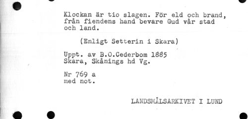 //// Klockan är tio slagen. För eld och brand, //// från fiendens hand bevare Gud vår stad //// och land. //// (Enligt Setterin i Skara) //// Uppt. av B.O.Cederbom 1835 //// Skara, Skånings hd Vg. //// Nr 769 a //// med not. //// LANDSMÅLSARKIVET I LUND ////