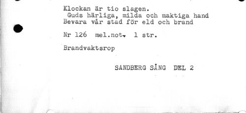 //// Klockan är tio slagen. //// Guds härliga, milda och maktiga hand //// Bevara vår stad för eld och brand //// Nr 126 mel. not-* 1 str. //// Brandvaktsrop //// SANDBERG SÅNG DEL 2 ////