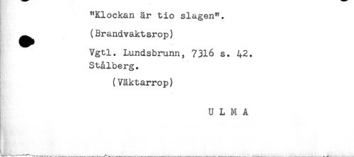 //// "Klockan är tio slagen". //// .. //// ^^ (Brandvakt srop) //// Vgtl. Lundsbrunn, 7316 s. 42. //// Stålberg. //// (Väktarrop) //// - //// U L M A //// - //// - //// _________ ////