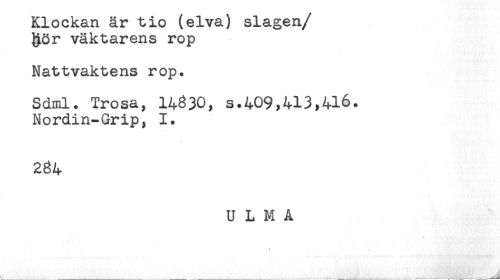 //// Klockan är tio (elva) slagen/ //// &ör väktarens rop //// Nattvaktens rop. //// Sdml. Trosa, 14830, s.409,413,416. //// Nordin-Grip, 1. //// 234 //// U L M A ////