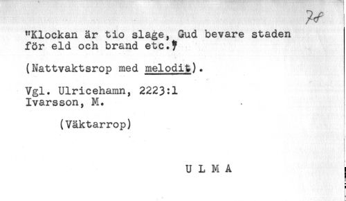 //// "Klockan är tio slage, Gud bevare staden //// för eld och brand etc.? //// (Nattvaktsrop med melodit). //// Vgl. Ulricehamn, 2223:1 //// Ivarsson, M. //// (Väktarrop) //// U L M A { //// e //// f //// t //// t //// * ////