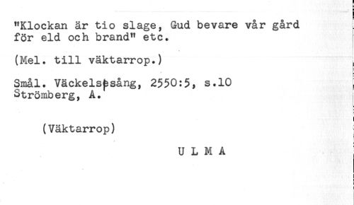 //// ) //// = //// "Klockan är tio slage, Gud bevare vår gård //// för eld och brand" etc. //// * //// (Mel. till väktarrop.) ^ //// Smål. Väckelsfssång, 2550:5, s.10 //// Strömberg, A. //// (Väktarrop) //// U L M A //// i //// i //// L ////