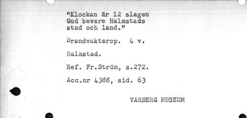 //// I Brandvaktsrop. 4 v. //// } Halmstad. //// Ref. Fr.Ström, s.272. //// Acc.nr 43^6, sid. 63 //// VARBERG MUSEUM ////
